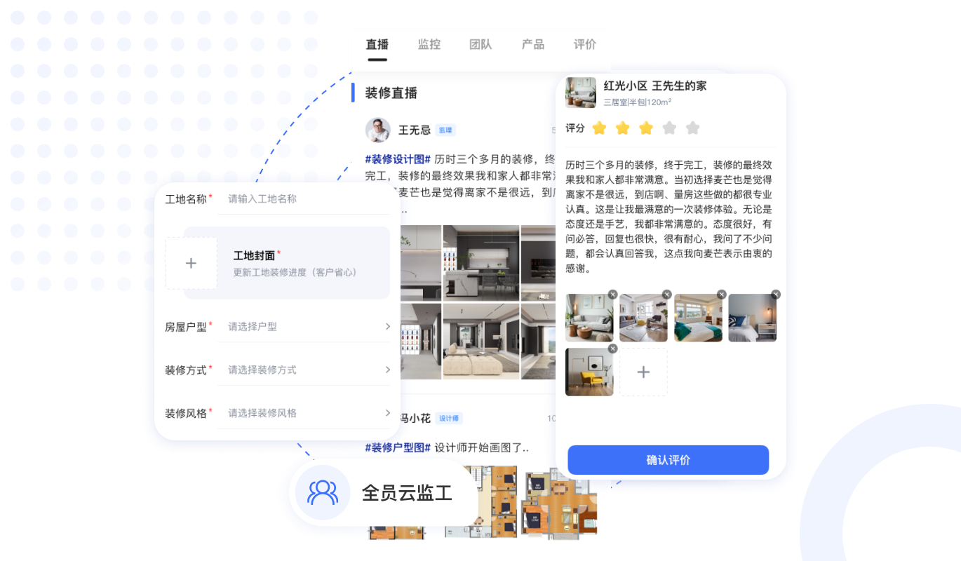 工地實(shí)時監(jiān)控直播,業(yè)主足不出戶,實(shí)時觀看裝修現(xiàn)場,工地圖文,視頻,VR全景實(shí)時更新,保證裝修進(jìn)度。